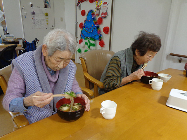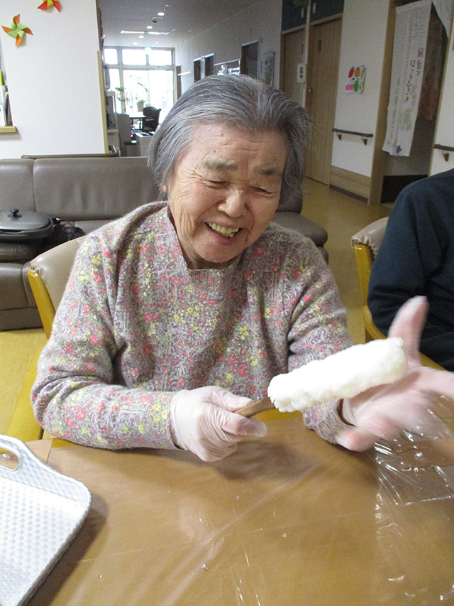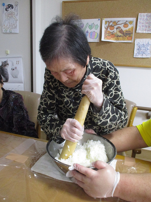 ユニット2では、11月9日に毎年恒例のたんぽ会を行いました。炊き立ての新米を皆さんで協力して潰し、たんぽにしました。皆さん手際よく作業され、和気あいあいと楽しそうでした。お昼にきりたんぽ鍋にして召し上がって頂きました。