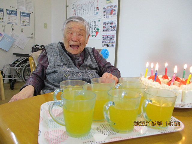 ユニット3では、101歳のお誕生日を迎えられた方のお誕生会を開きました。ケーキを頬張り、とても喜んでおりました。