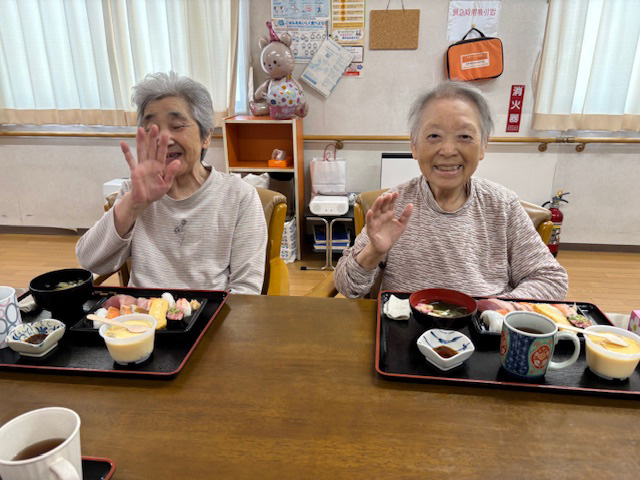 9月15日 各ユニットで市内のスーパーやスシローから握り寿司、茶わん蒸し、大学芋、モンブラン等を購入し、敬老の日のお祝いをしています。12貫もあるお寿司をペロッと召し上がる方もおり、大変喜ばれていました。
