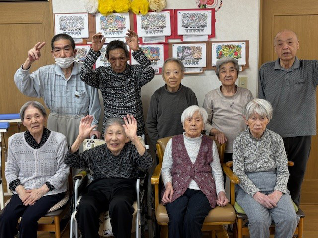 2月生まれの方が77歳の喜寿を迎え、紫のちゃんちゃんこを着用し、お祝いをしています。本人も自身の年齢に驚き、他者からのお祝いの言葉や家族・施設からの衣類等のプレゼントも大変喜ばれていました。