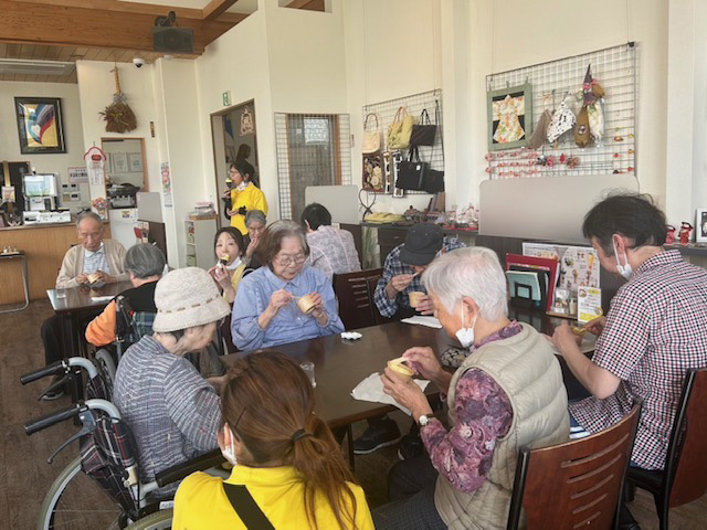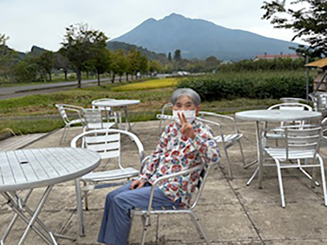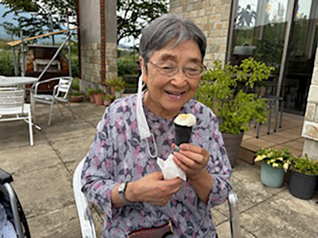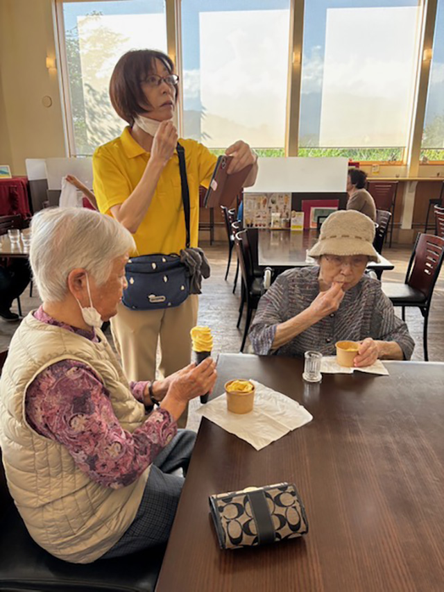 9月6日 ユニット2では嶽へドライブ外出をしました。天気に恵まれ、車内では岩木山を眺めながらの移動です。直売所「野市里」へ寄り、買い物を楽しまれ、レストランで嶽きみソフトクリームを召し上がり、とても楽しまれた様子でした。