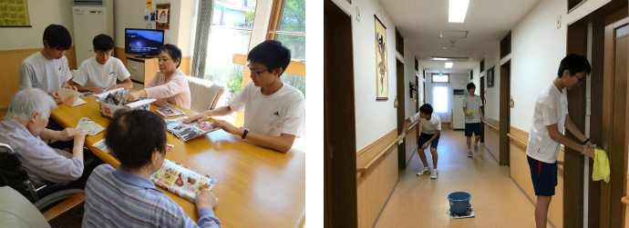 身長の高い男子生徒には普段職員の手の届かない窓などを掃除してもらいました。張り切って掃除してくれたのでTシャツが汚れてしまい、バンドーの黄色いポロシャツを着ていただいたのですが、ニコニコと明るい笑顔で入居者様や職員と接してくれる様子はバンドーの職員の一員に見間違うほどでした。